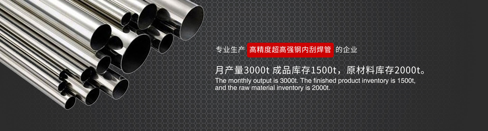 我們專業生產高精度內刮焊管,主要產品有汽車用高精度傳動軸管;汽車及摩托車用車架、儀表架、減震器管、排氣管;空調儲液器用管;黃油槍管;電機外殼用管;健身器材用管;家具用管;中低壓鍋爐用管;油田用套管、抽油泵管;冷拔或精扎管及管胚;臺鉆立柱用管;電線用套管;冷凍機械用精密鋼管等。月產量3000t 成品庫存1500t,原材料庫存2000t。